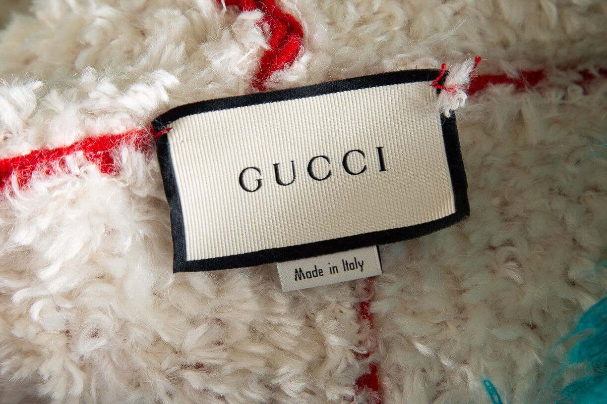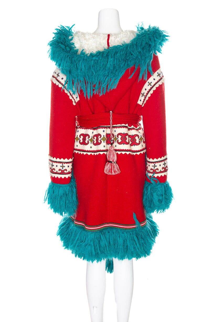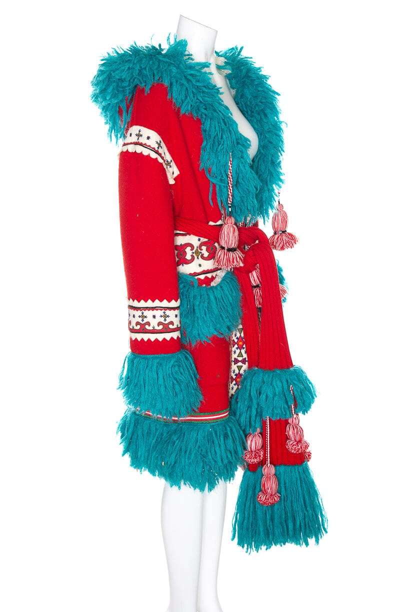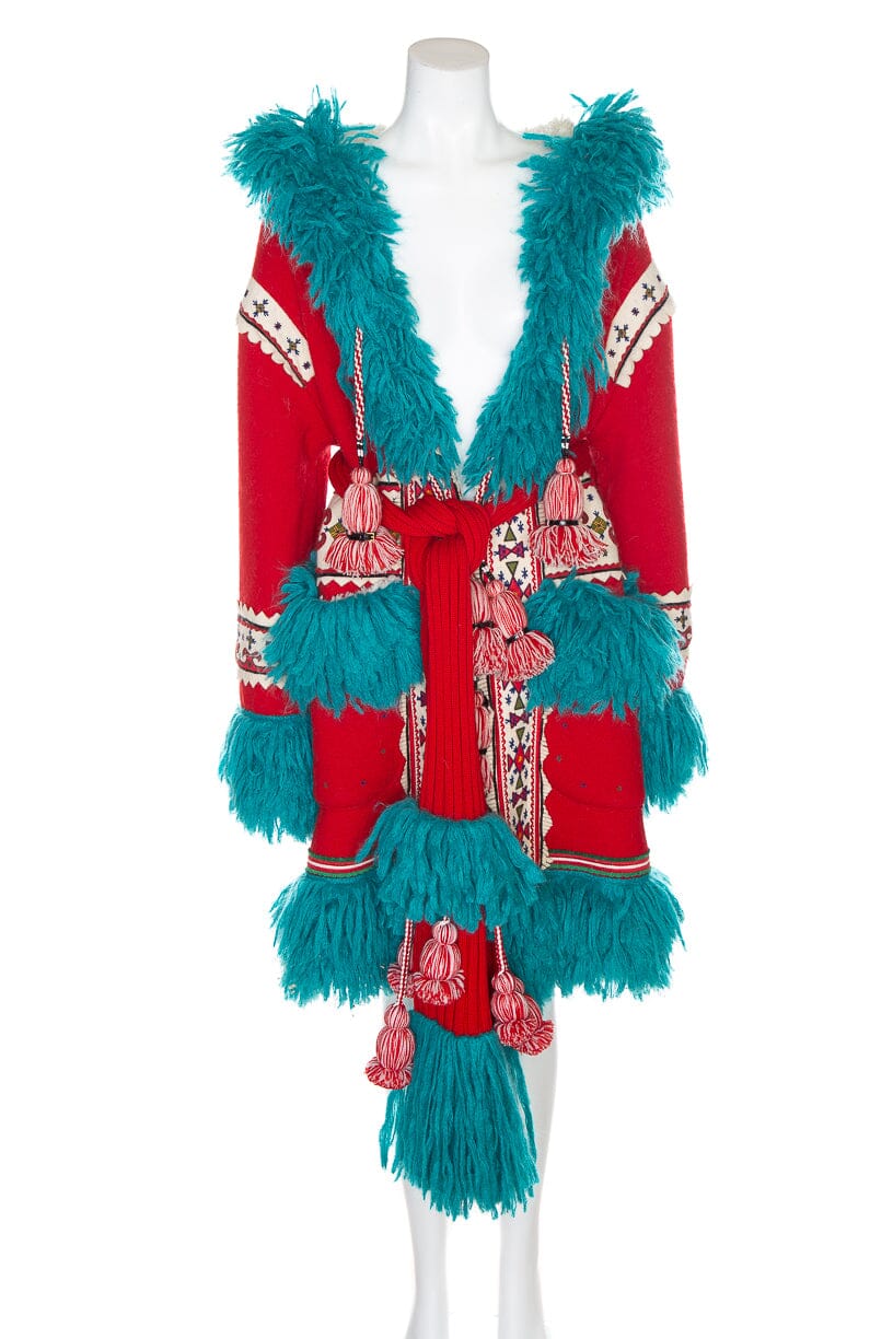 Gucci F/W 2018 Red/Turquoise/White Pom Pom Fringe Faux Fur Coat. This item is in very good condition.
